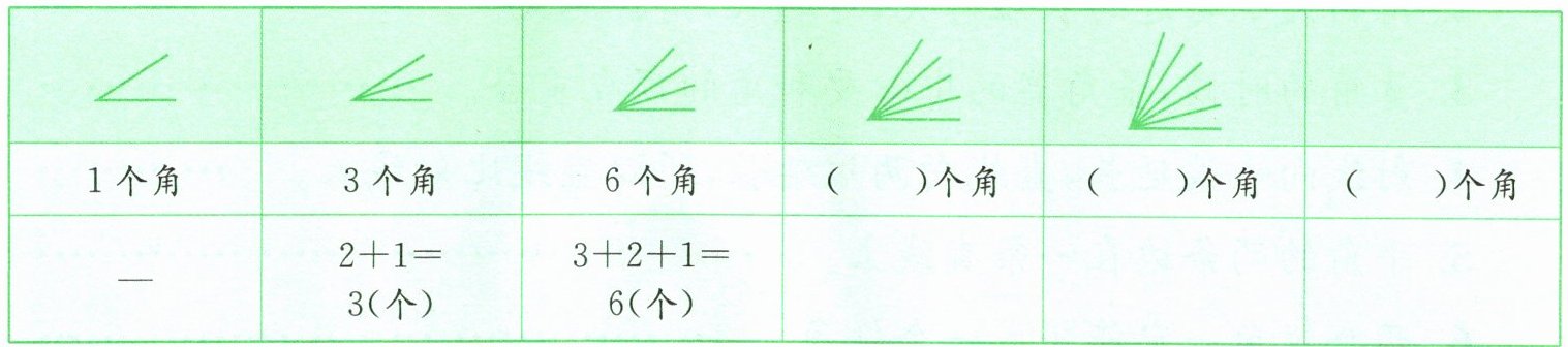 观察图形,从一个顶点出发的射线条数依次为2、3、4、5、6、7条。角的数量规律为从1加到射线条数减1的和。