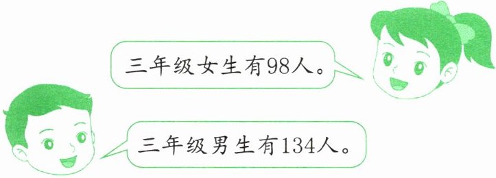 三年级一共有232人,男生有134人,女生有多少人?232 - 134 = 98 (人)