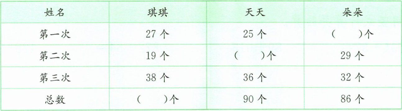 2. 3名同学比赛夹豆子,成绩如下,把表格填写完整。