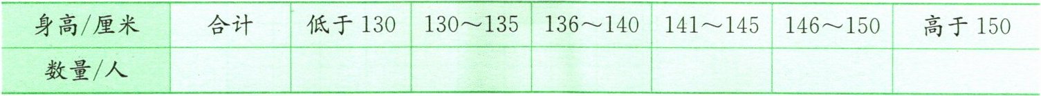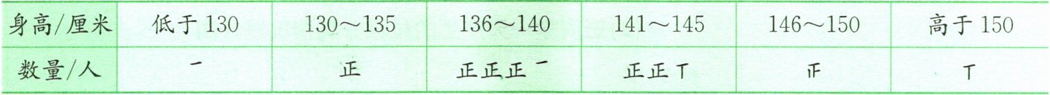 首先根据“正”字统计法计算各身高段人数:低于130厘米1人,130~135厘米5人,136~140厘米16人(3个“正”字加1笔),141~145厘米12人(2个“正”字加2笔),146~150厘米5人(1个“正”字),高于150厘米2人(2笔)。合计人数:1+5+16+12+5+2=41人。