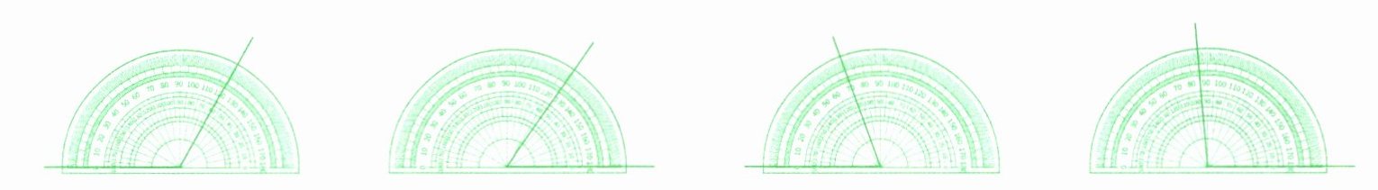 1. 看一看量角器上的刻度,把各个角的度数写下来。