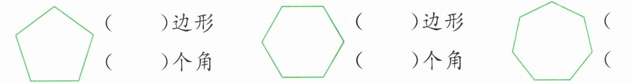 根据图形边的数量确定多边形名称,边数等于角的数量。第一个图形有5条边,是五边形,有5个角;第二个图形有6条边,是六边形,有6个角;第三个图形有7条边,是七边形,有7个角。